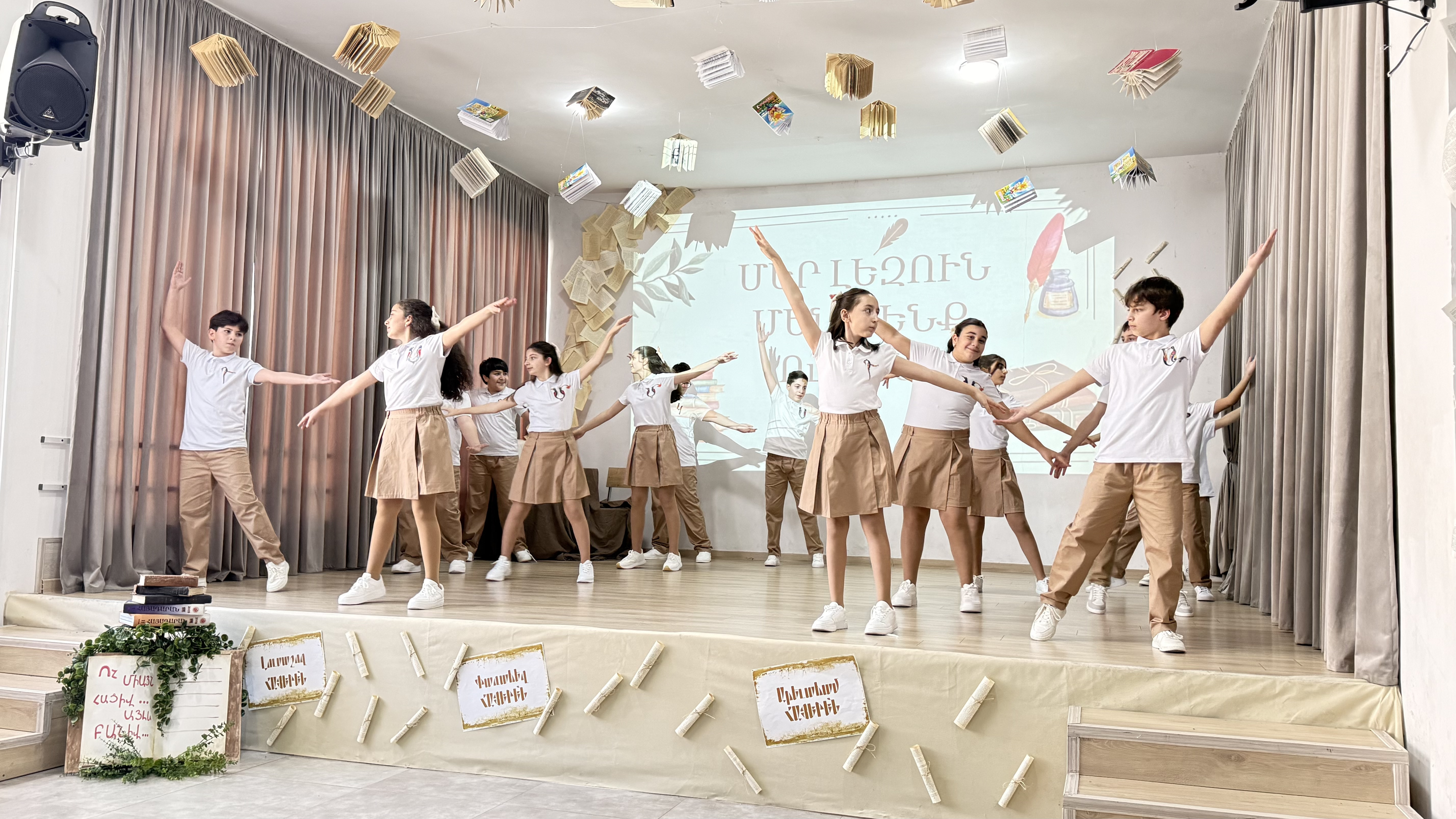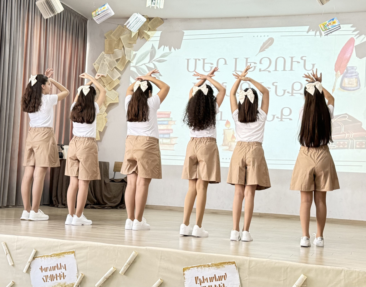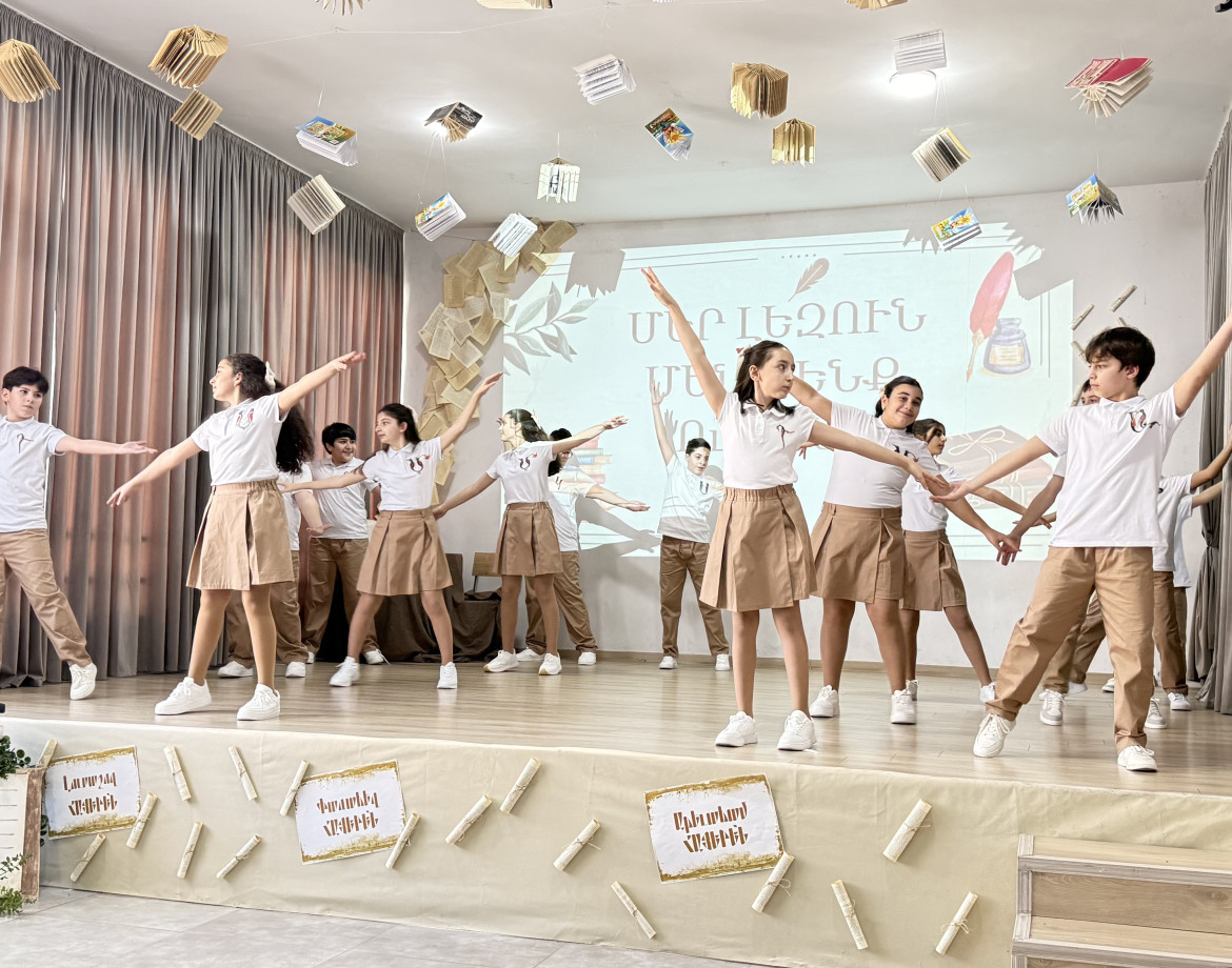 Ուսումցիների պատմական մտաճամփորդությունն այնուհետև անցնում էր հայոց լեզվի հնագույն արմատներին։ Ներկայացման ընթացքում շեշտվում էր այն կարևոր միտքը, որ հայերենը աշխարհի հնագույն լեզուներից է և ունի բացառիկ պատմական ուղի։ Այն ոչ միայն գոյատևել է հազարամյակներ, այլև դարձել է ազգի ինքնության հենասյունը։ Միջոցառման առանցքային հատվածներից մեկը նվիրված էր հայոց գրերի ստեղծմանը։ Բեմում կենդանանում էր այն ժամանակաշրջանը, երբ եկեղեցական արարողությունները կատարվում էին օտար լեզուներով, և ժողովուրդը չէր հասկանում աղոթքի խոսքը։ Երկխոսությունների միջոցով աշակերտները ներկայացնում էին այն ցավն ու ցայտնոտը, որն ապրում էր հավատացյալ ժողովուրդը։